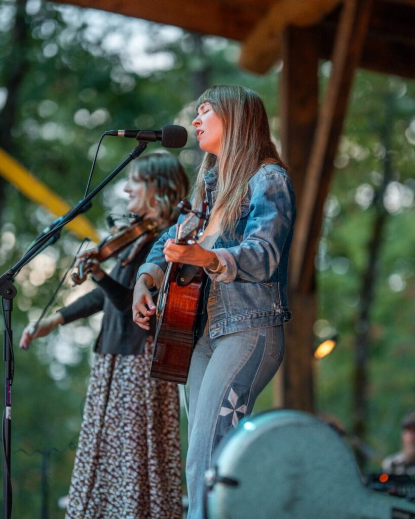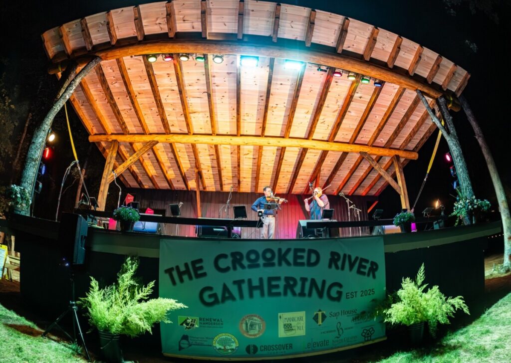 Why Crooked River? Crooked River is our affectionate nickname of the woodland that hosts the event. The far southwest corner of the woodland sits on a high bank called the Eagles Nest that looks out on a sharp “crook” of the Ossipee river. “Crooked” is also a reference to a term from bluegrass and old time music in which people are teaching each other a new tune, and the structure has an unexpected twist (usually a chord change) that needs to be remembered, and a “crooked tree” is one that has been strengthened by adapting to find the best source of light (@Molly Tuttle). Therefore, “Crooked” best embodies our connection to the land, to bluegrass music, and to finding the light wherever we can.